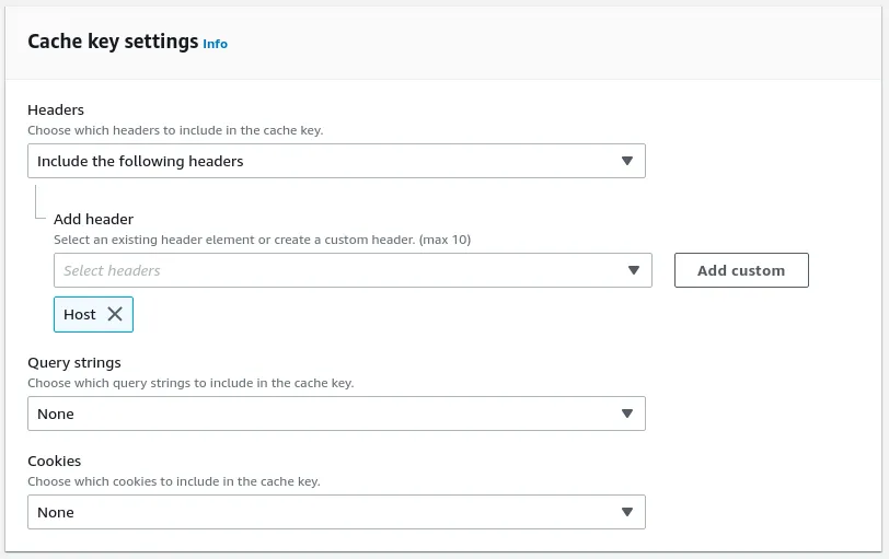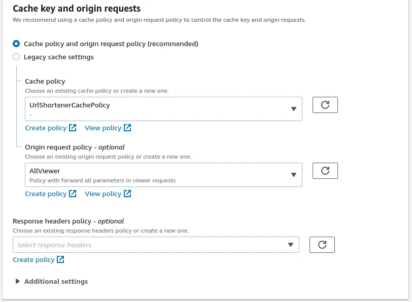 In order to make caching work correctly, we select our previously created custom Caching Policy. Additionally, we require to known the host that is called to resolve the full request url including the full domain. For that we simply use the “AllViewer” policy.